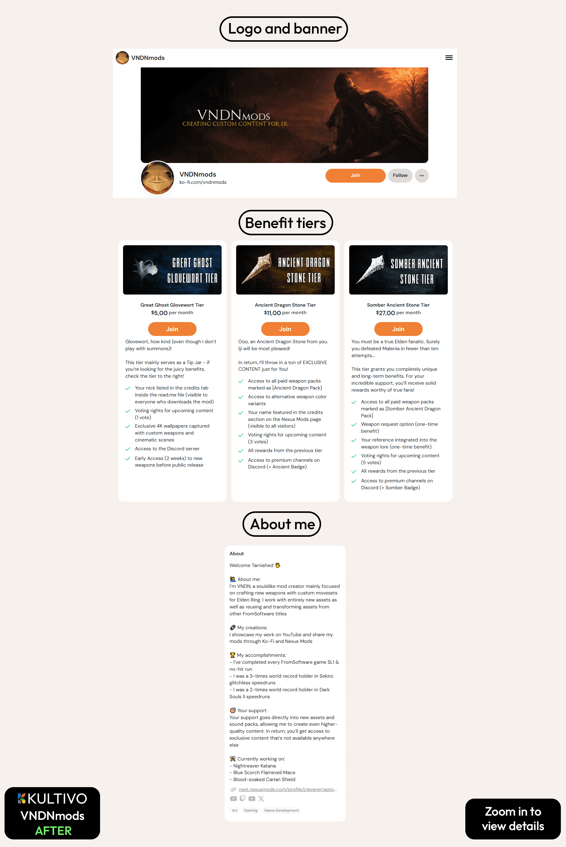 We prepared a comprehensive overview and designed the redirect systems: mapping out client acquisition pathways and identifying the most effective ways to showcase subscription links to Ko-fi. We also recommended additional social media channels where large, theme-based communities centered around Elden Ring are active. We advised on where to place promotional elements in the content, such as premium assets available to subscribers and proposed a range of content-locking methods with clearly defined rules. For example, offering three armor set mods for free while reserving two additional ones only for higher subscription tiers.