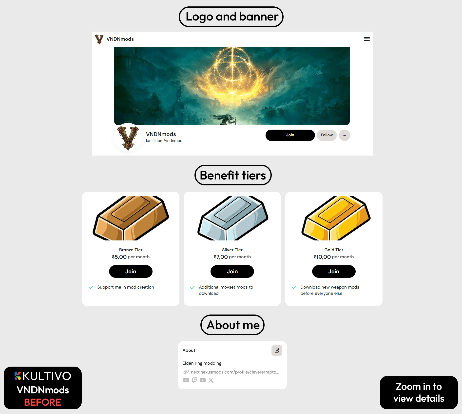 The VNDNmods creator profile has undergone a complete redesign by our team. The updated version immediately stands out thanks to a more cohesive visual identity, particularly in the improved logo and background banner, which are now far less generic and better aligned with the overall theme. The most significant change, however, is the complete overhaul of the membership section. Previously inconsistent tiers: “Bronze”, “Silver” and "Gold" have been replaced with thematic levels inspired by in-game upgrade items. This shift adds strong appeal for the target audience.